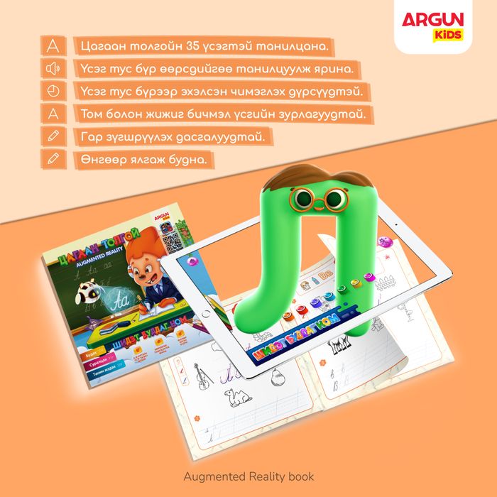 Буддаг ном нь хүүхдийн гарыг зүгшрүүлэх, өнгө будаг ялгах, уран сэтгэмжийг дэмжих, анхаарлаа төвлөрүүлэн сууж сурах, орон зайн баримжаа нь хөгжиж, бичиж сурахын үндэс болох жижиг булчингийн хөгжлийг дэмждэг. Дэвшилтэт "Augmented Reality" технологийн тусламжтайгаар будсан цагаан толгойн үсэгнүүд амилж, өөрсдийгөө танилцуулж, дуу авиагаа гаргаж хүүхдийн төсөөллийг бодит мэт болгосон шидэт буддаг ном юм. Цагаан толгойн дуу авиа, хөдөлгөөн, дүр төрхийг ажиглаж, тоглонгоо суралцаарай.