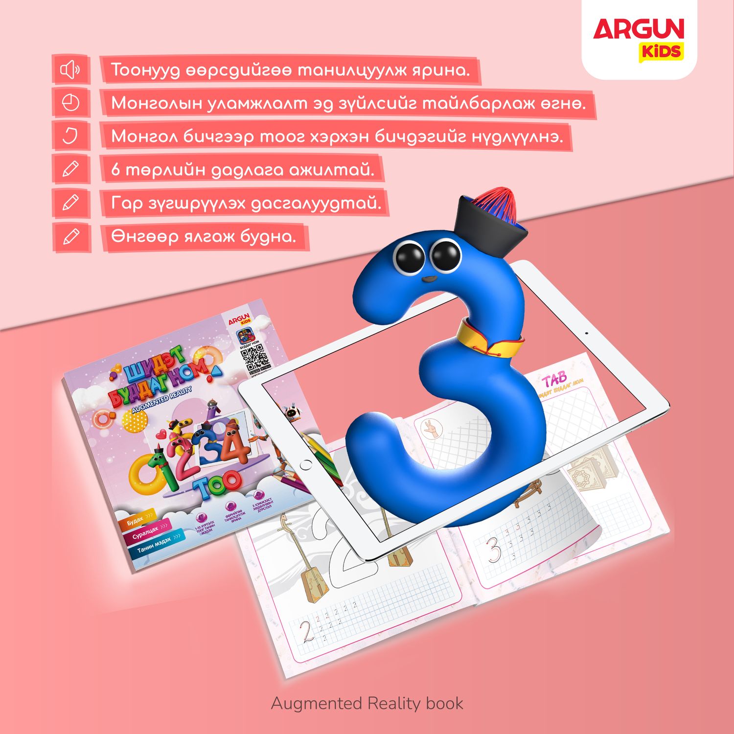 Буддаг ном нь хүүхдийн гарыг зүгшрүүлэх, өнгө будаг ялгах, уран сэтгэмжийг дэмжих, анхаарлаа төвлөрүүлэн сууж сурах, орон зайн баримжаа нь хөгжиж, бичиж сурахын үндэс болох жижиг булчингийн хөгжлийг дэмждэг. Дэвшилтэт "Augmented Reality" технологийн тусламжтайгаар будсан тоонууд амилж, өөрсдийгөө танилцуулж, дуу авиагаа гаргаж хүүхдийн төсөөллийг бодит мэт болгосон шидэт буддаг ном юм. Тооны дуу авиа, хөдөлгөөн, дүр төрхийг ажиглаж, тоглонгоо маш амархан суралцаарай.