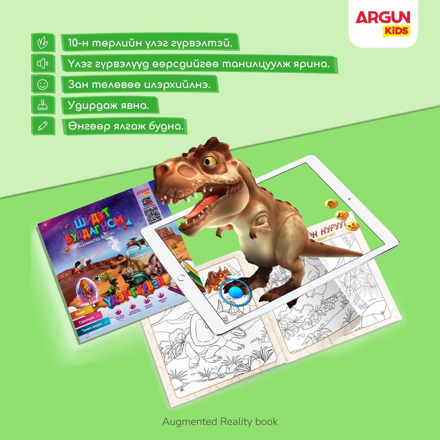 Буддаг ном нь хүүхдийн гарыг зүгшрүүлэх, өнгө будаг ялгах, уран сэтгэмжийг дэмжих, анхаарлаа төвлөрүүлэн сууж сурах, орон зайн баримжаа нь хөгжиж, бичиж сурахын үндэс болох жижиг булчингийн хөгжлийг дэмждэг. Дэвшилтэт "Augmented Reality" технологийн тусламжтайгаар будсан үлэг гүрвэлүүд амилж, өөрсдийгөө танилцуулж, дуу авиагаа гаргаж хүүхдийн төсөөллийг бодит мэт болгосон шидэт буддаг ном юм. Үлэг гүрвэлийн дуу авиа, хөдөлгөөн, дүр төрхийг ажиглаж, тоглонгоо суралцаарай.