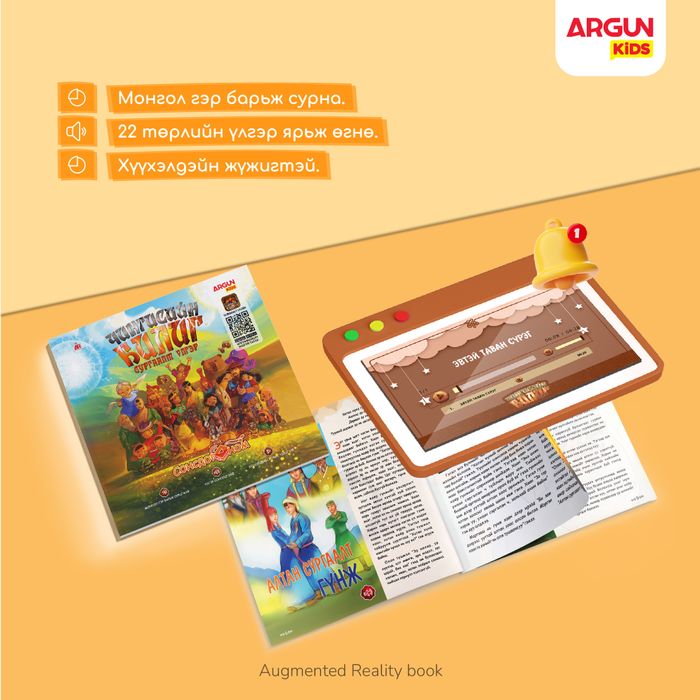 AR технологиор баяжуулсан Чингисийн билиг сургаалт үлгэр нь дотроо: Авшиг шившиг хоёрын үлгэр, Алтан сургаалт гүнж, Алтан үст үнэг, Ариун үйлст хүүгийн үлгэр, Ачлал тусын хариу, Бэрх гурван даваа гэх мэтчилэн 22 сэдэвт үлгэрүүд багтсан болно.
