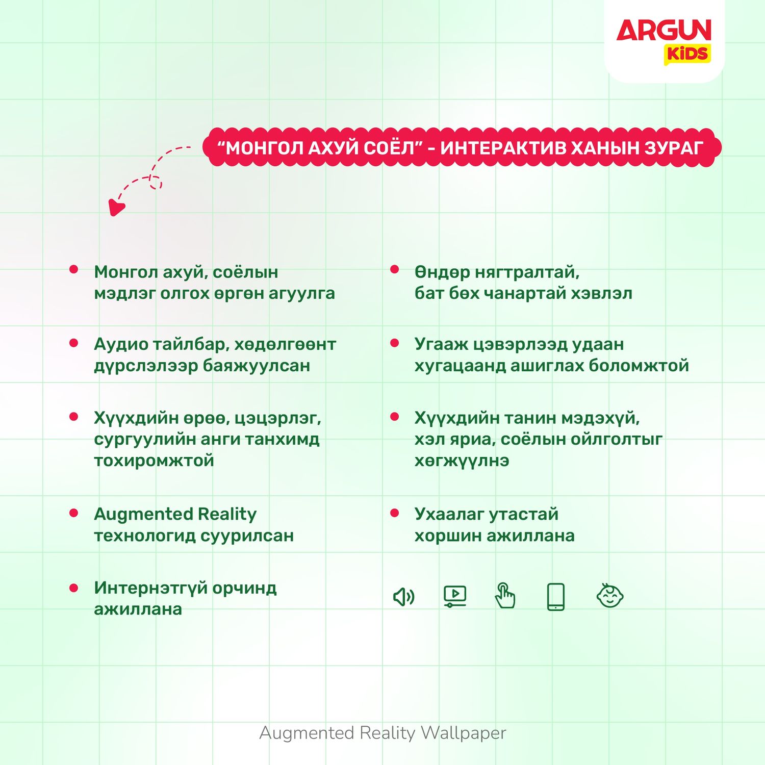 Монгол ахуй соёл - Эрийн гурван наадам, Таван хошуу мал, Монгол гэрийн бүтэц гэх мэт 52 төрлийн монгол ахуй соёлын тухай агуулгыг сонихолтой 2D, аудио контентоор таниулна.